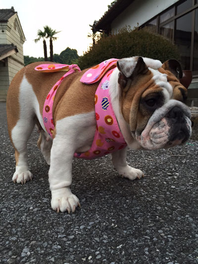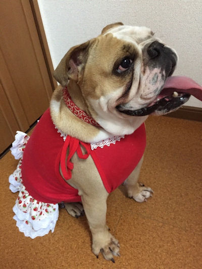 可愛いお客様(ブルドッグ)からのお写真です。キャミソールワンピースが、とっても似合っていて可愛いです。カジュアルワンピースもバッチリですね。とっても可愛いです。