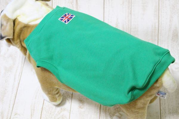 緑のトレーナー生地に、ユニオンジャックのお洒落な刺繍ワッペンが付いたとってもシンプルで可愛いタンクトップになります。